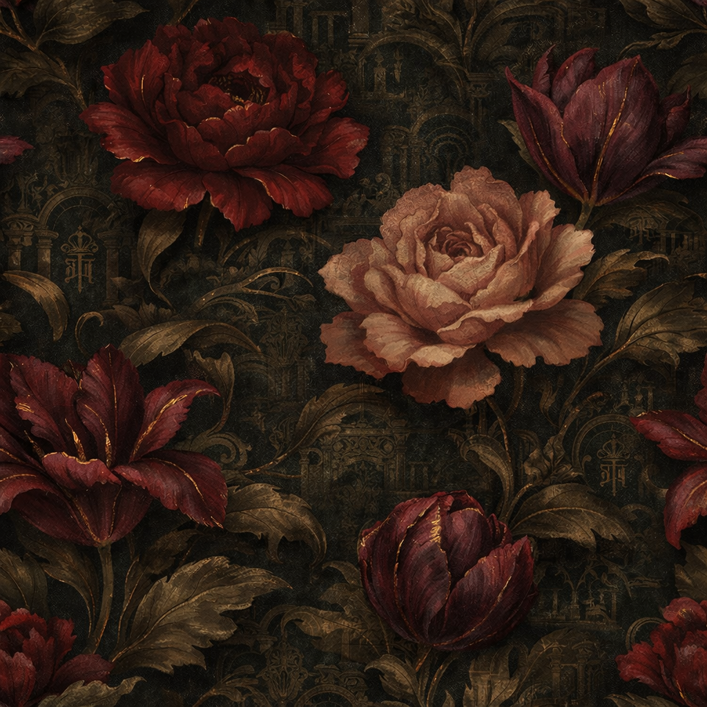 Subtle symbolic motifs are woven throughout the design, embedded within stems, leaves, and negative space. These details reference lineage, continuity, and legacy, revealing themselves gradually as the pattern repeats across a wall or is viewed from a distance. Tonal architectural impressions appear quietly within the background, echoing classical ornament and enduring authority without becoming literal or overt.